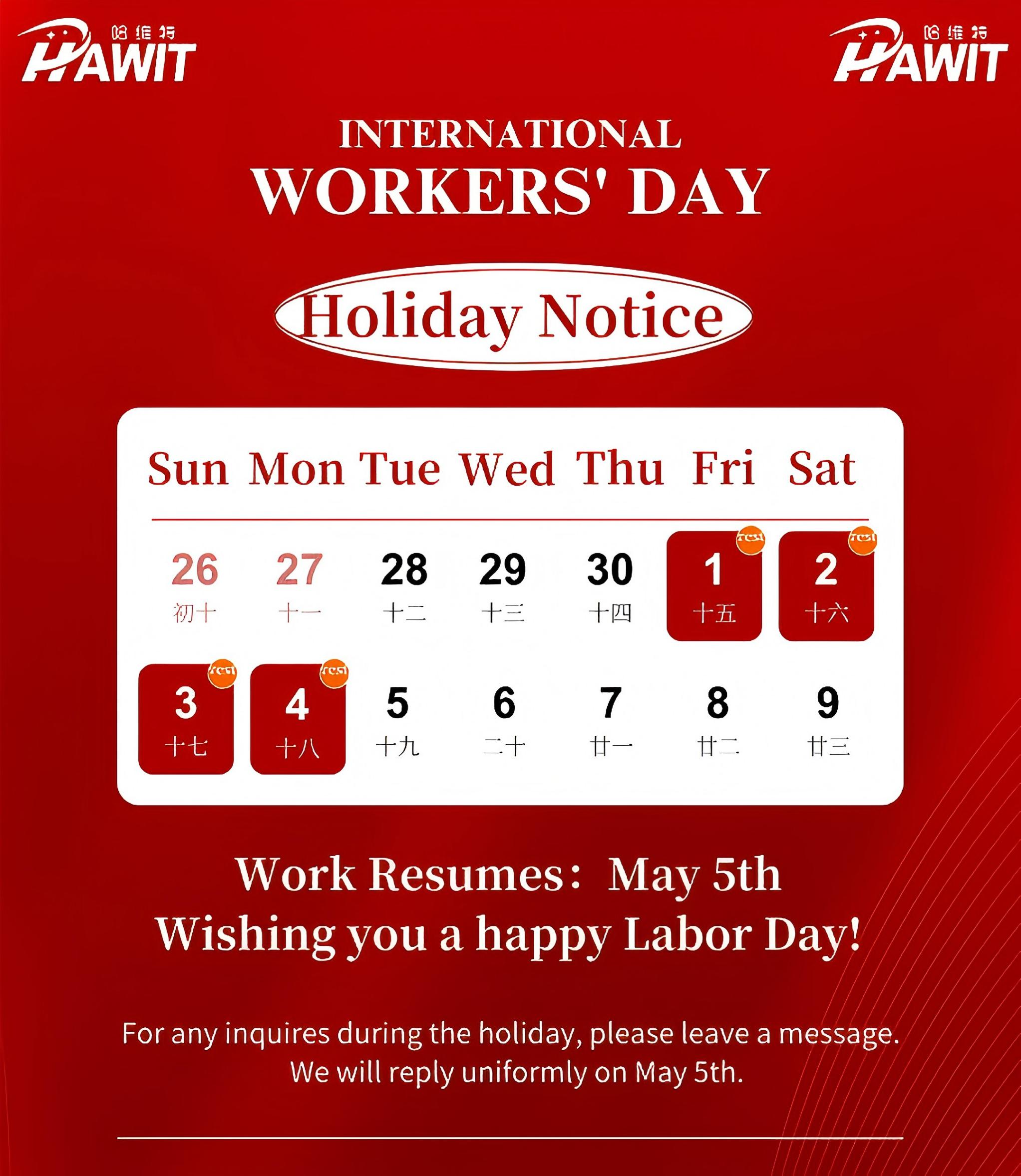 • Stay safe while traveling during the holiday, and take fire and theft prevention measures at home. Wishing you a peaceful and enjoyable break.